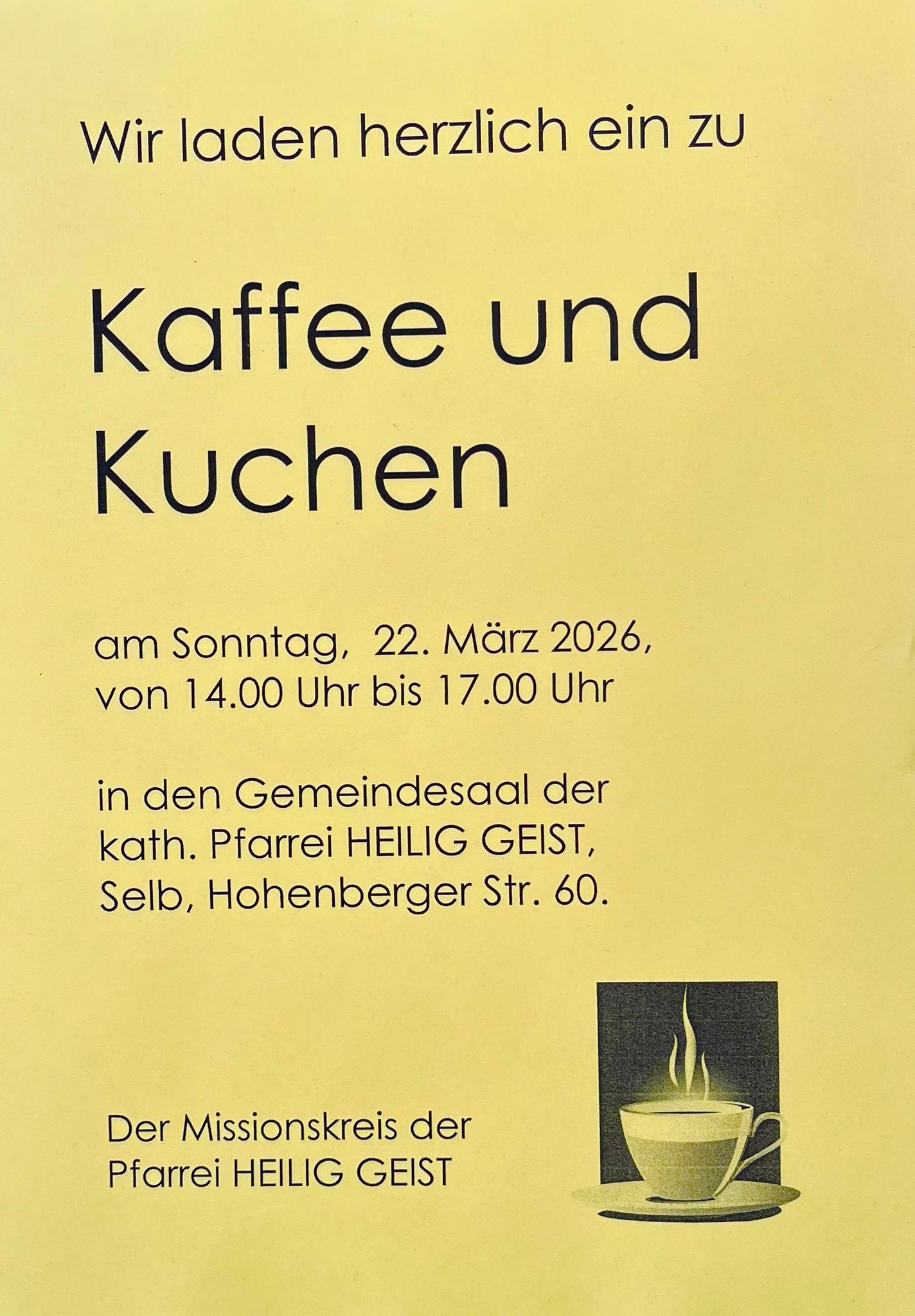 So 22.03.26, 14:00 Uhr Kaffee und Kuchen, Pfarrsaal Heilig Geist Hohenberger Straße 60 (mehr)