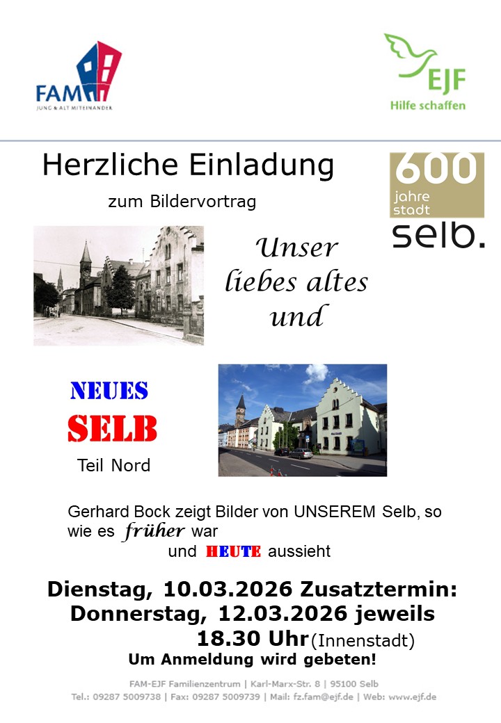 Di 10.03.26, 18:30 Uhr Vortrag Gerd Bock "Unser liebes altes und neues Selb - Nord", FAM (mehr)