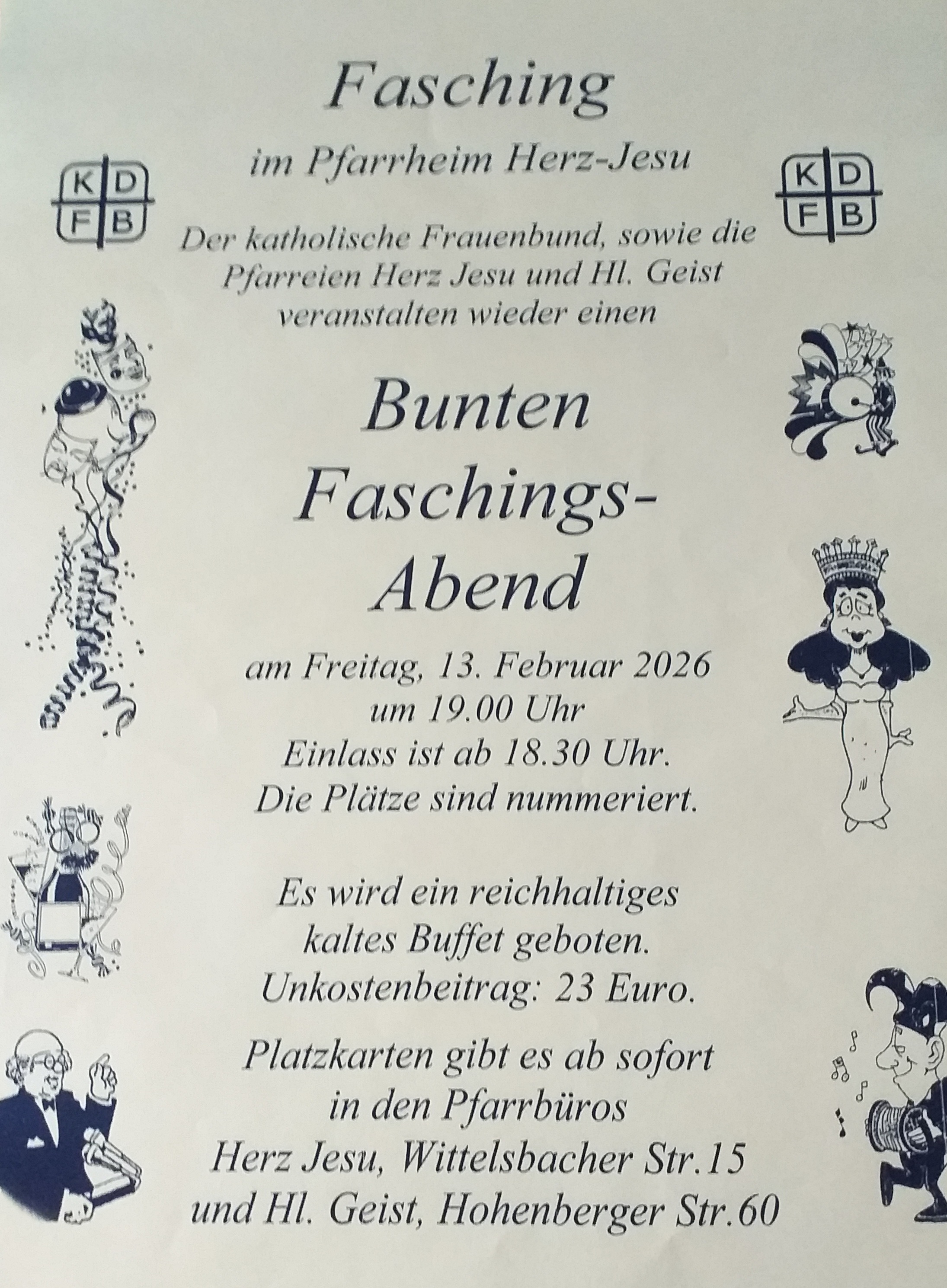 Fr 13.02.26, 19:00 Uhr Pfarrfasching im Pfarrheim Herz-Jesu (mehr)